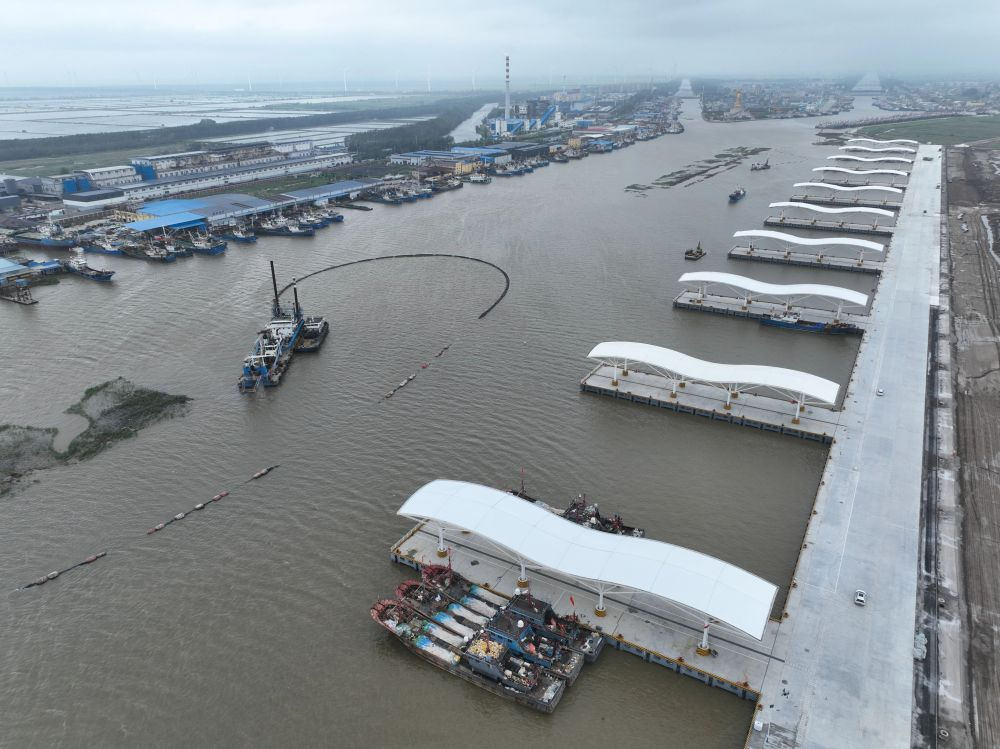 江蘇鹽城黃沙港國(guó)家中心漁港二期工程于2024年9月建成試運(yùn)營(yíng),包含2022.42米順岸碼頭、16座突堤碼頭及配套設(shè)施,是國(guó)內(nèi)首座全自動(dòng)化漁業(yè)碼頭,配備智能卸貨系統(tǒng)、水產(chǎn)品交易區(qū)、冷凍倉儲(chǔ)等設(shè)施。