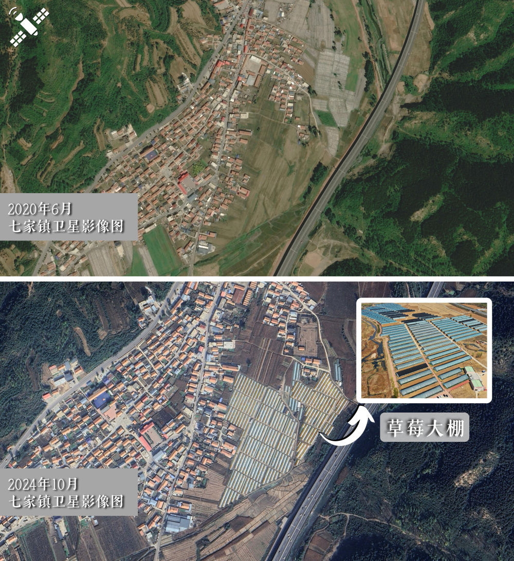 解讀:對(duì)比2020年6月(上圖),2024年10月七家鎮(zhèn)連片溫室草莓大棚衛(wèi)星圖中的反光區(qū)域顯著增加(下圖)。