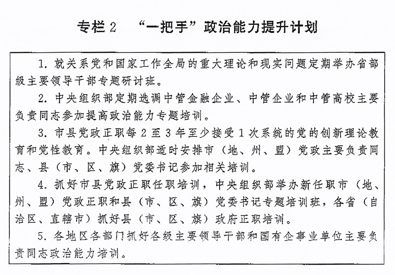 。ǘ┩怀觥瓣P(guān)鍵少數(shù)”政治訓(xùn)練。堅持把政治訓(xùn)練貫穿干部成長全周期,使干部的政治素養(yǎng)、政治能力與擔(dān)負(fù)的領(lǐng)導(dǎo)職責(zé)相匹配。強化“一把手”政治培訓(xùn),有計劃地選調(diào)地方、部門、國有企事業(yè)單位主要負(fù)責(zé)同志到黨校(行政學(xué)院)、干部學(xué)院參加專題培訓(xùn)。實施“一把手”政治能力提升計劃(專欄2)。。ㄗ灾螀^(qū)、直轄市)、市(地、州、盟)、縣(市、區(qū)、旗)黨政領(lǐng)導(dǎo)班子成員每2至3年到黨校(行政學(xué)院)、干部學(xué)院至少接受1次系統(tǒng)的黨的創(chuàng)新理論教育和黨性教育,5年內(nèi)累計不少于2個月。圍繞提高政治能力和領(lǐng)導(dǎo)能力,加強機關(guān)司局長、處長任職培訓(xùn)。重視對女干部、少數(shù)民族干部、黨外干部等的政治培訓(xùn)。加強對高層次人才的政治引領(lǐng),中央組織部會同有關(guān)單位每年組織一定數(shù)量人才開展國情研修。