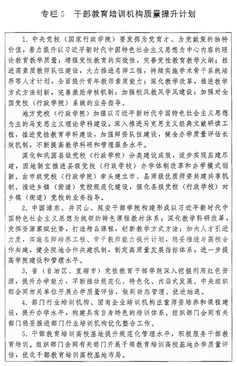 。ㄒ唬┡嘤(xùn)機構(gòu)建設(shè)。推進(jìn)各級黨校(行政學(xué)院)建設(shè),以教學(xué)督導(dǎo)、師資培養(yǎng)、質(zhì)量評估為重點,強化上級黨校(行政學(xué)院)對下級黨校(行政學(xué)院)的業(yè)務(wù)指導(dǎo),不斷提高辦學(xué)水平。推進(jìn)縣級黨校(行政學(xué)校)分類建設(shè)。加強社會主義學(xué)院建設(shè)。進(jìn)一步提升部門行業(yè)培訓(xùn)機構(gòu)、國有企業(yè)培訓(xùn)機構(gòu)辦學(xué)質(zhì)量。加強對干部教育培訓(xùn)高;、基層干部教育培訓(xùn)機構(gòu)辦學(xué)指導(dǎo)。開展黨校(行政學(xué)院)、。ㄗ灾螀^(qū)、直轄市)黨性教育干部學(xué)院、干部教育培訓(xùn)高校基地辦學(xué)質(zhì)量評估。加強各類黨員干部教育培訓(xùn)機構(gòu)規(guī)范管理,嚴(yán)控新設(shè)以黨員干部為培訓(xùn)對象的培訓(xùn)機構(gòu)。支持地方、部門聯(lián)合開展培訓(xùn),鼓勵干部教育培訓(xùn)機構(gòu)開展區(qū)域協(xié)作交流,推動優(yōu)質(zhì)培訓(xùn)資源共享。實施干部教育培訓(xùn)機構(gòu)質(zhì)量提升計劃(專欄5)。