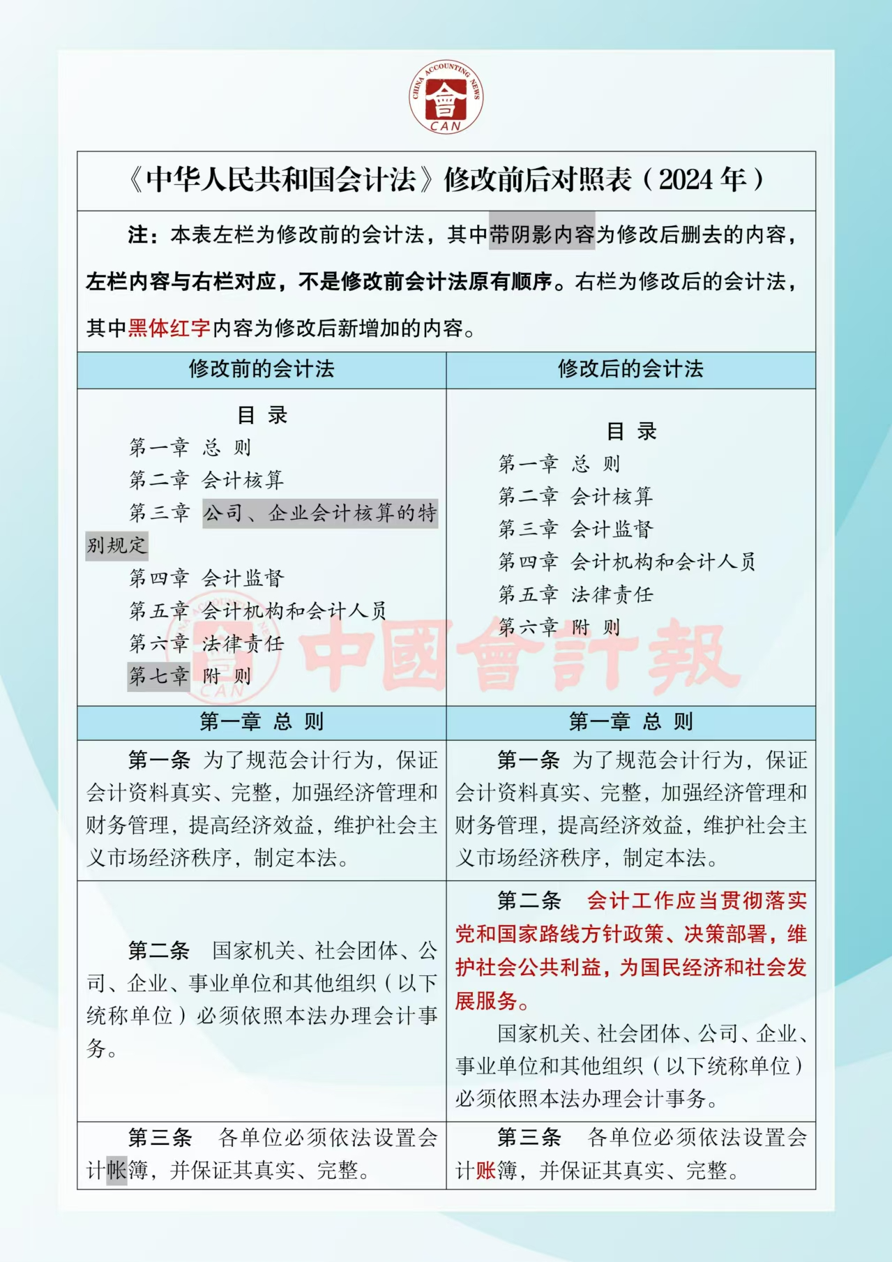 《中華人民共和國會計法》修改前后對照表(2024年)