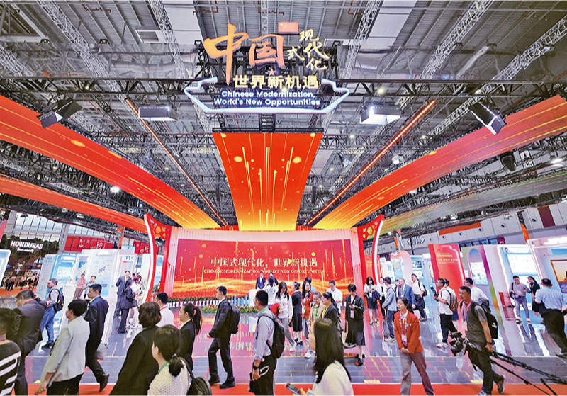 黨的十八大以來,我們堅定奉行互利共贏的開放戰(zhàn)略,成為140多個國家和地區(qū)的主要貿易伙伴,對世界經濟增長的貢獻率保持在30%左右。2023年11月5—10日,以“新時代,共享未來”為主題的第六屆中國國際進口博覽會在上海市舉辦,展覽面積約36.7萬平方米,共有289家世界500強和行業(yè)龍頭企業(yè)參展,均超歷屆水平,折射出中國市場的巨大吸引力。圖為觀眾在國家綜合展中國館參觀。 人民圖片 唐克/攝