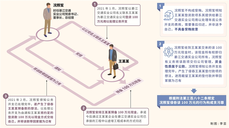 其中,2020年底,況照笙與副總經(jīng)理馬某某商議,安排工作人員唐某從綦江交通實(shí)業(yè)公司發(fā)包的工程中套取工程款用以處理年底公務(wù)開支。之后況照笙擔(dān)心唐某套取的資金不夠,于2021年1月以綦江交通實(shí)業(yè)公司名義聯(lián)系與綦江交通實(shí)業(yè)公司有業(yè)務(wù)往來的私企老板王某某,請(qǐng)其為綦江交通實(shí)業(yè)公司墊資100萬(wàn)元用以處理公務(wù)開支,并安排王某某預(yù)備100萬(wàn)元現(xiàn)金,承諾今后通過王某某企業(yè)在綦江交通實(shí)業(yè)公司已承接的工程中以虛增工程成本的方式歸還。2021年2月,況照笙得知唐某已處理完公務(wù)開支,遂產(chǎn)生了侵吞王某某預(yù)備款的想法,便仍以處理公務(wù)開支為由通知王某某將約定的墊資款以現(xiàn)金方式交給自己,并將該款帶回家據(jù)為己有。2023年12月,王某某告訴況照笙其墊付的100萬(wàn)元款項(xiàng)尚未歸還,況照笙隨即讓其在承接綦江交通實(shí)業(yè)公司的工程中多開100萬(wàn)元成本發(fā)票報(bào)銷。
