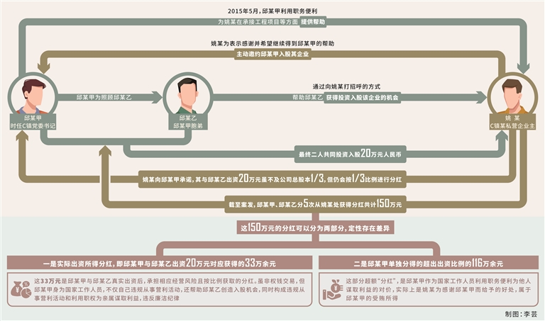 違反廉潔紀律。2015年5月,時任C鎮(zhèn)黨委書記的邱某甲為C鎮(zhèn)某私營企業(yè)主姚某在承接工程項目等方面提供幫助,姚某為表示感謝并希望繼續(xù)得到邱某甲的幫助,主動邀約邱某甲入股其實際控制的某私營企業(yè)。為照顧胞弟邱某乙,邱某甲通過向姚某打招呼的方式,幫助邱某乙也獲得投資入股該企業(yè)的機會,最終二人共同投資入股20萬元人民幣(幣種下同),邱某甲僅出資但未實際參與經營。2018年至2022年,二人從上述企業(yè)按出資比例分紅共33萬余元。