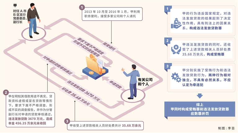 我們認為,對于甲收受好處并違法發(fā)放貸款的行為,應(yīng)當(dāng)以受賄罪與違法發(fā)放貸款罪數(shù)罪并罰。一是甲分別實施了受賄行為和違法發(fā)放貸款行為,通常情況下,銀行工作人員違法發(fā)放貸款不必然要求其以受賄為手段,同理,即使銀行工作人員收受了賄賂,也不必然導(dǎo)致違法發(fā)放貸款,違法發(fā)放貸款行為和受賄行為相對獨立,不具有必然關(guān)系,不應(yīng)認定為牽連犯。二是兩個行為侵害的法益不同,違法發(fā)放貸款罪侵害的法益是國家金融管理秩序及貸款秩序,其要義在于信貸資金的流動性和安全性,受賄罪侵害的法益是國家工作人員職務(wù)行為的廉潔性和不可收買性,在不違反禁止重復(fù)評價原則基礎(chǔ)上,對行為侵犯的每個法益均應(yīng)當(dāng)進行評價。故甲同時構(gòu)成受賄罪和違法發(fā)放貸款罪,應(yīng)數(shù)罪并罰。